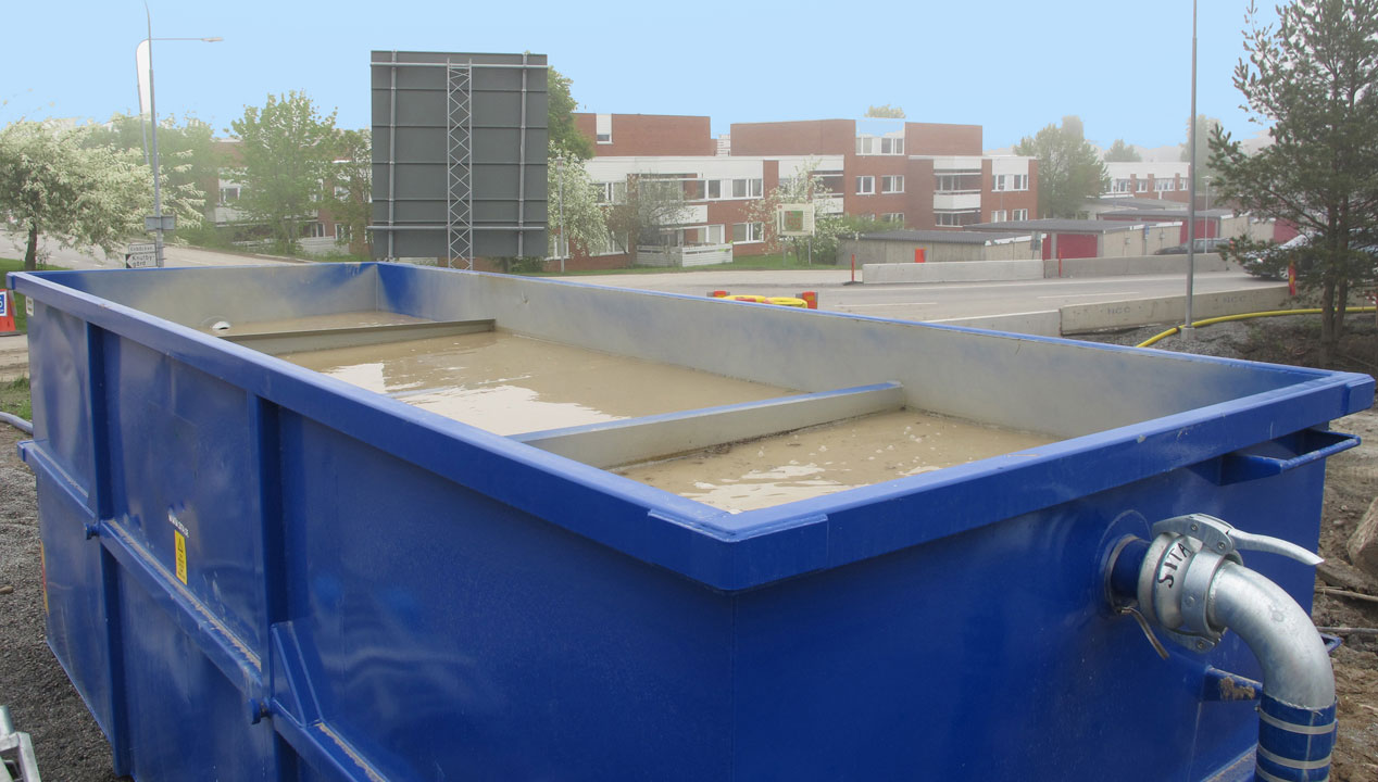 När vatten pumpas virvlar partiklar runt i vattenströmmarna. Sedimenteringscontainern gör att vattnet strömmar långsammare och partiklarna faller därmed till botten. Ett oljeavskiljarsteg finns i containern och det kan kompletteras med ytterligare steg. Den övre vattenfasen pumpas bort och sedimentet i containerns botten hämtas med slambil från PreZero .
